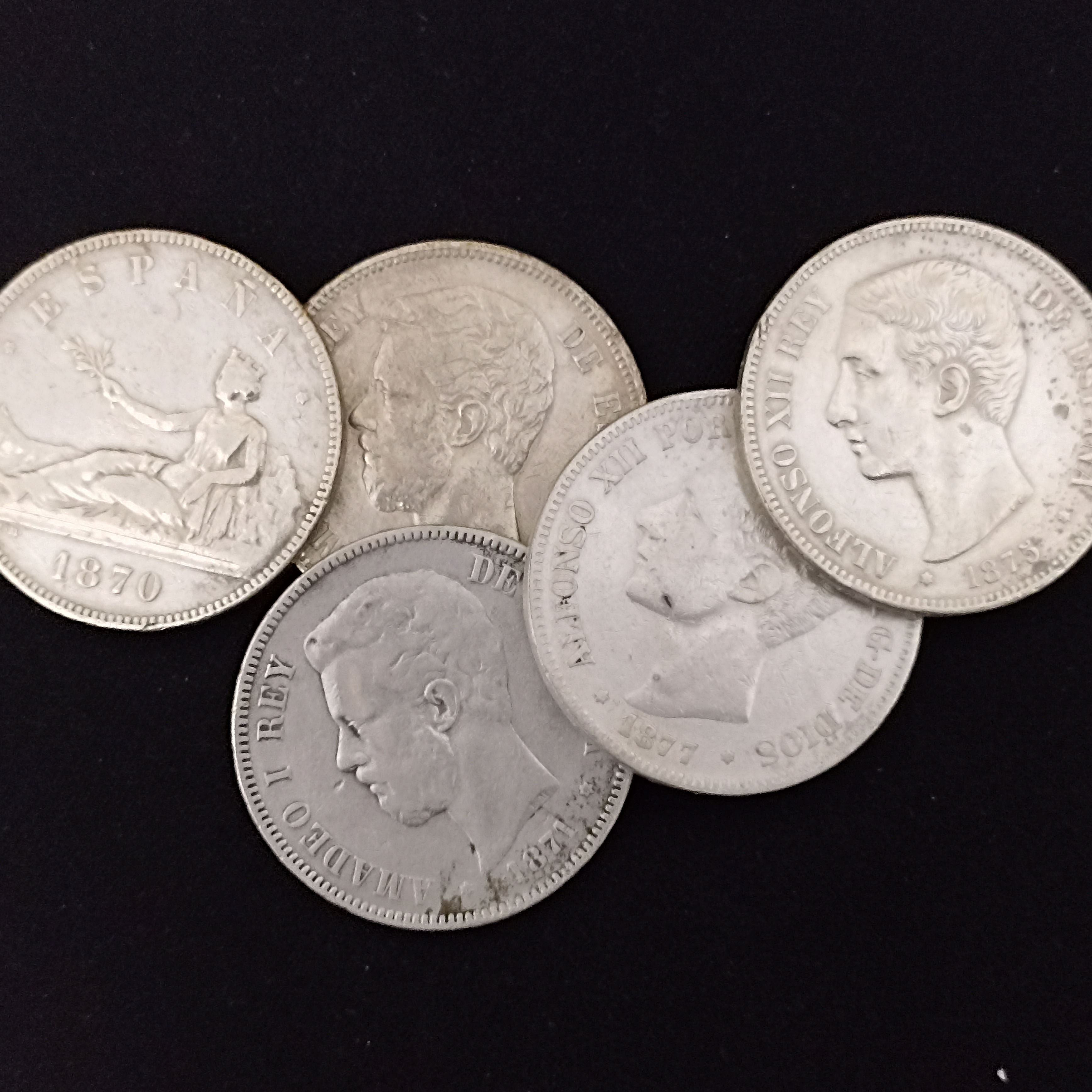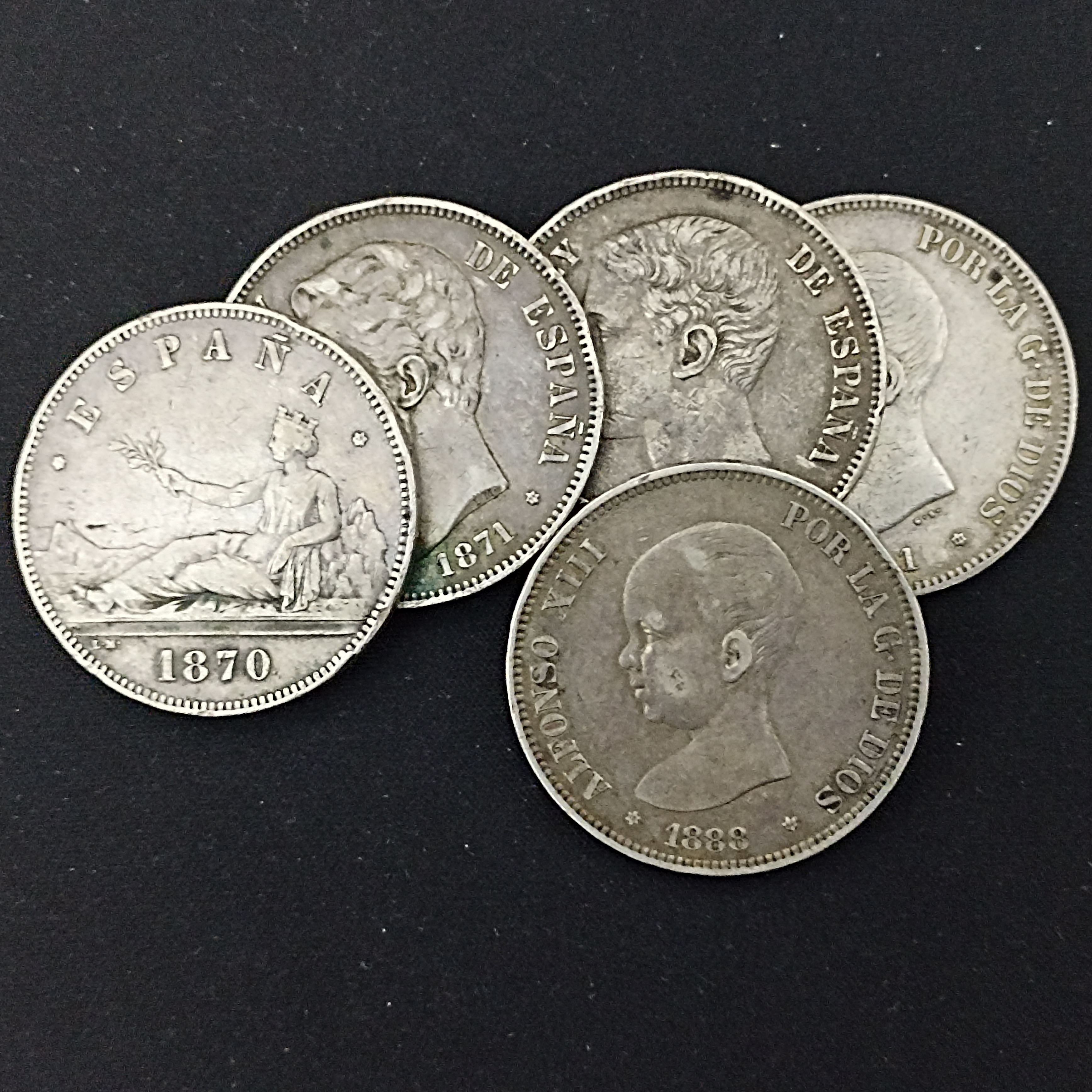 5 Pesetas. AR. Lote de 5 monedas. 1870, 1871, 1876, 1888 y 1891. Algun...