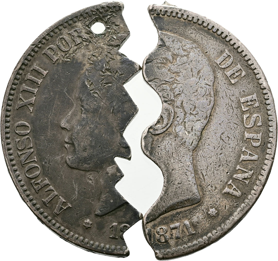 5 Pesetas. AR. Lote de 2 monedas cortadas por la mitad. Amadeo I 1871 ...