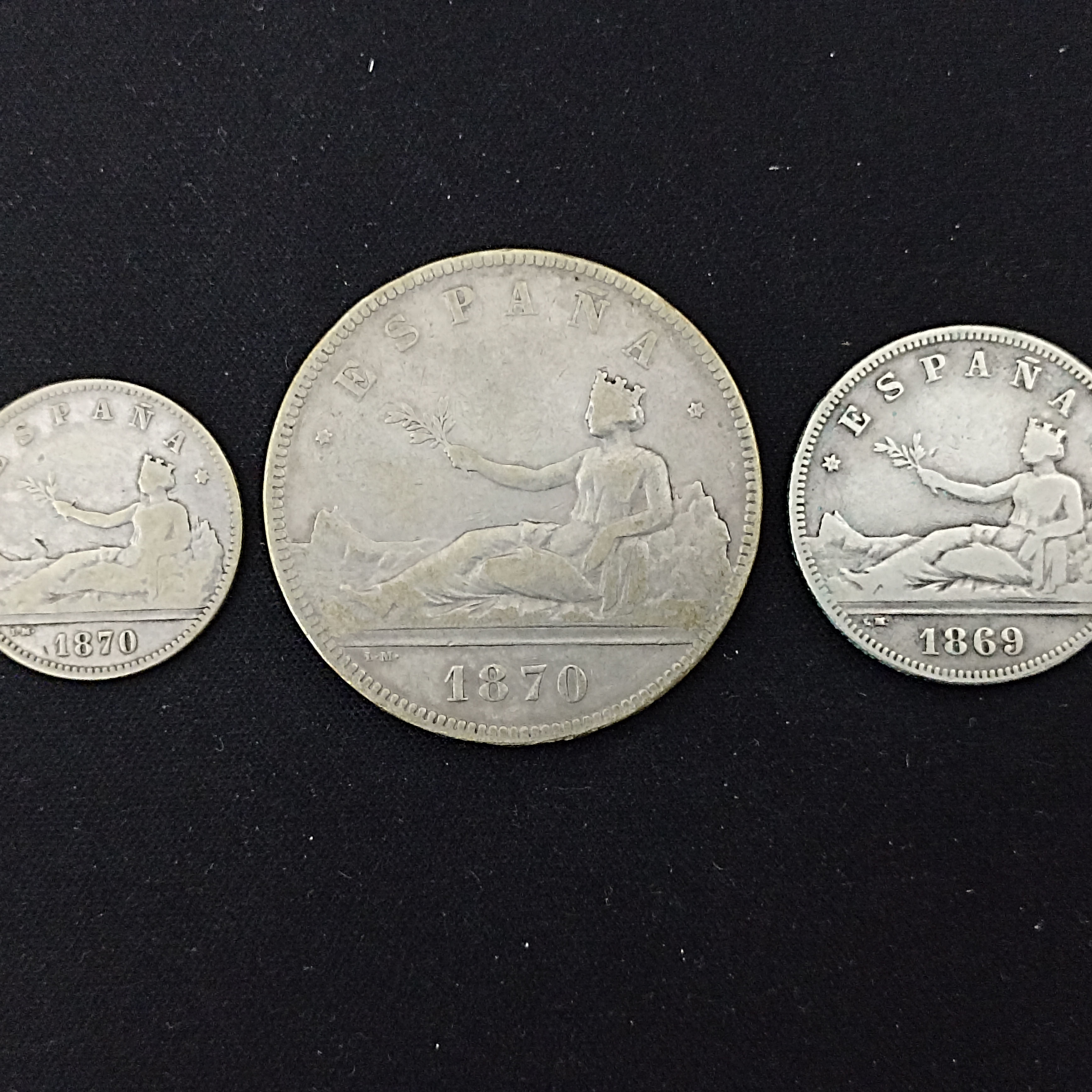 Serie de 3 valores. AR. Peseta 1870, 2 Pesetas 1869 y 5 Pesetas 1870. ...