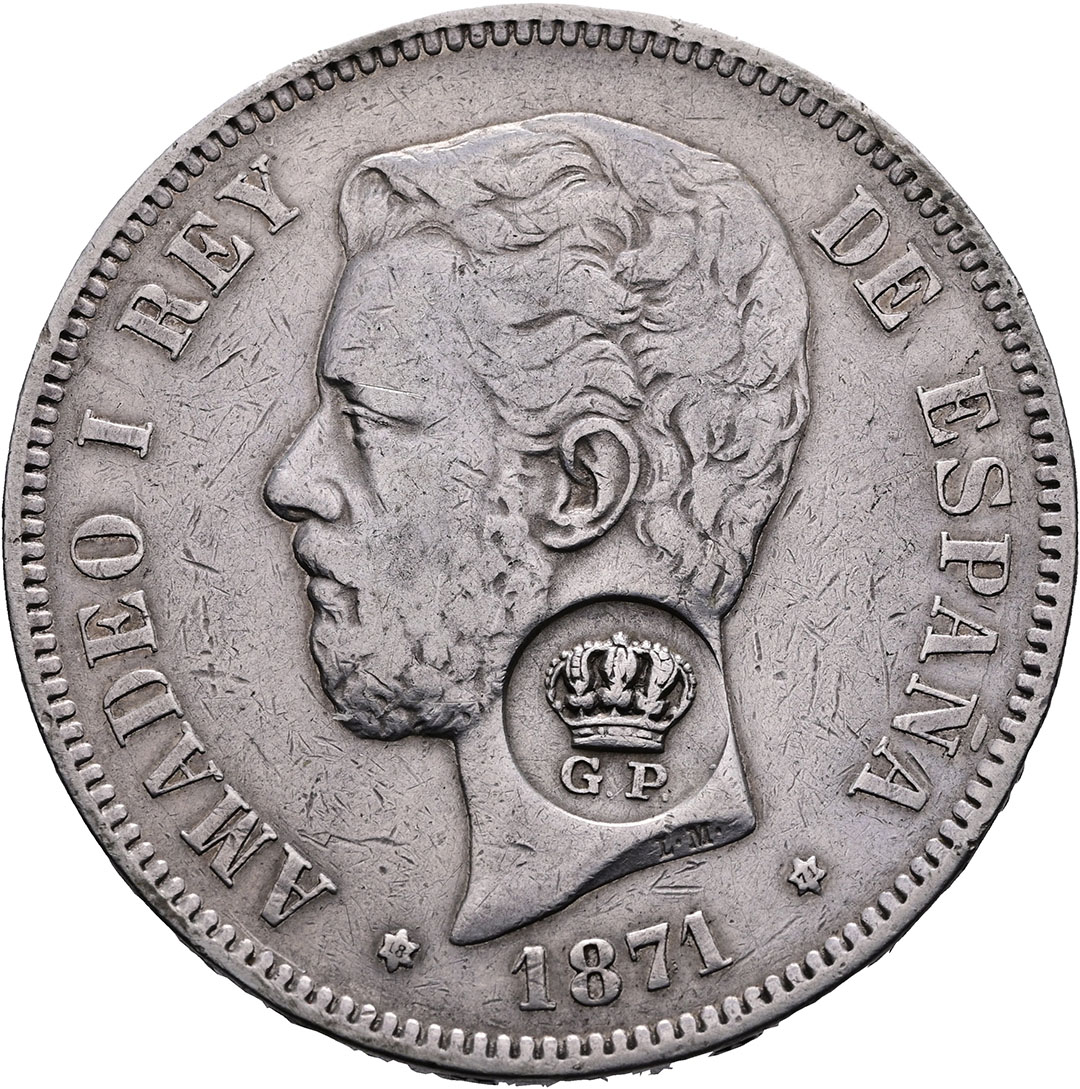 5 Pesetas. AR. 1871 *18-71 SDM. Resello FALSO de GP coronado sobre el ...