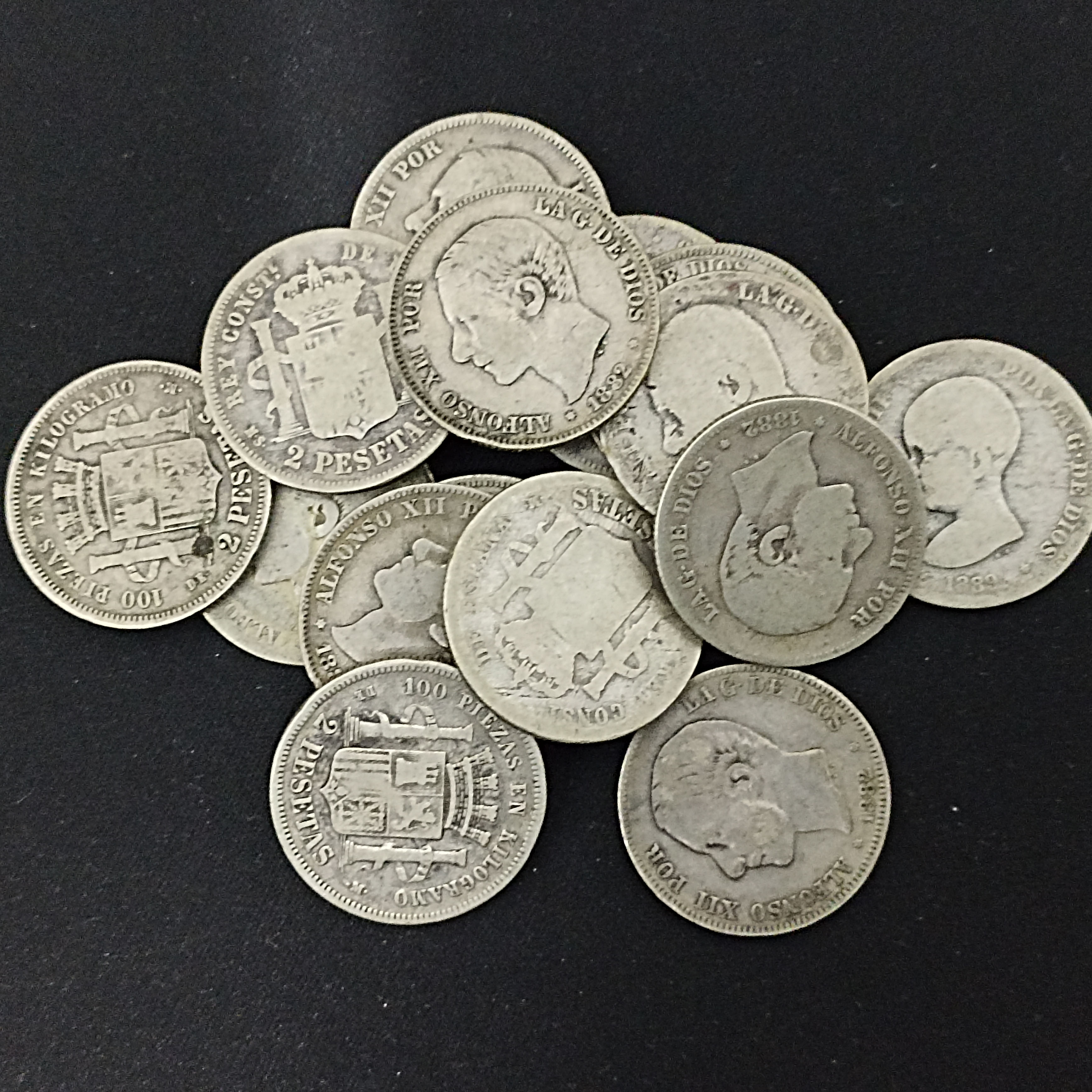 2 Pesetas. AR. Lote de 15 monedas. G. Provisional (3), Alfonso XII (10...