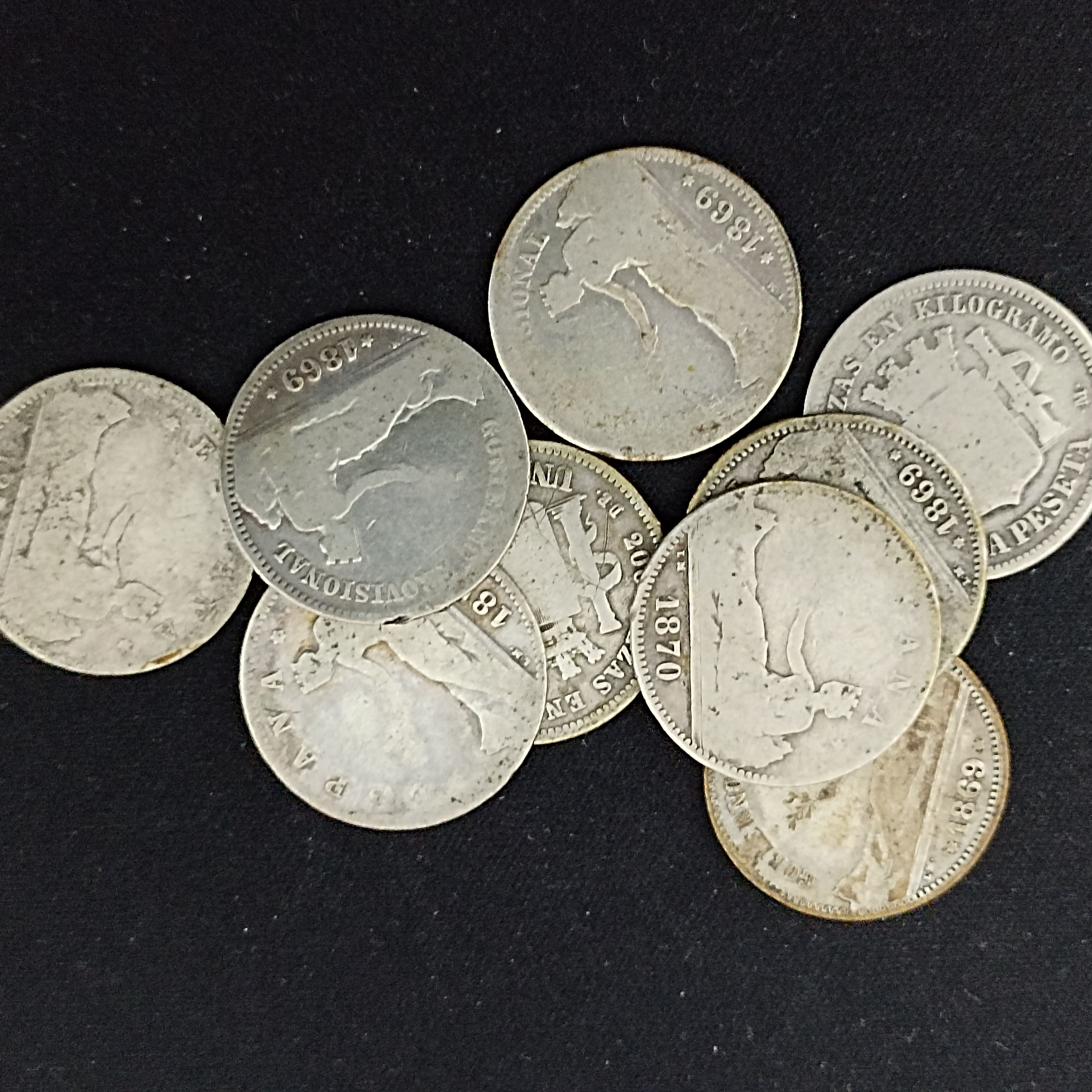 Peseta. AR. Lote de 9 monedas. 1869 (5) y 1870 (4). BC- a RC. ...
